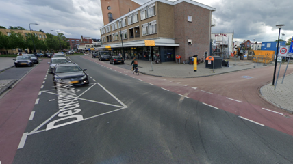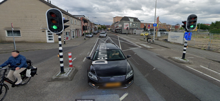 Op het stoplicht links zit een voetgangersoversteekknop. De voetganger moet eerste over het fietspad en kan dan de voetgangersknop bedienen. Aan de andere kant van de straat hetzelfde (kruising met fietspad). De gemeente heeft toegezegd dat zij deze situatie nader zullen bestuderen hoe dit anders en veiliger kan.