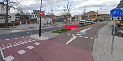 De rode pijl geeft aan waar fietsers oversteken. Dit leidt tot gevaarlijke situaties.
